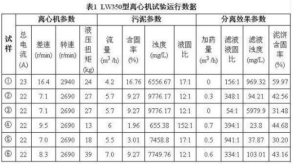 2010年10月底,公司選用麗水市恒力離心機械設(shè)備有限公司的LW350A型臥螺離心機對循環(huán)水污泥進行了定性試驗,LW350A型離心機的主要參數(shù)為:螺旋差速10~30r/min、轉(zhuǎn)鼓轉(zhuǎn)速2800r/min、電機功率55kW。絮凝劑選用濃度為1.5‰的陰離子型聚丙烯酰胺,試驗數(shù)據(jù)見表1。