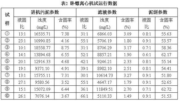 試運行期間,進機污泥參數(shù)變化不大,離心機各項參數(shù)基本保持為:污泥流量20m3/h、差速8r/min、轉(zhuǎn)速1800r/min、主機電流30A。試運行數(shù)據(jù)見表2。