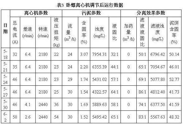 在參數(shù)的摸索調(diào)節(jié)中,轉(zhuǎn)鼓轉(zhuǎn)速過大會造成離心機本體的磨損和增加動力消耗,轉(zhuǎn)速過小,達不到處理效果,在前期運行轉(zhuǎn)速1800r/min的情況下,適當(dāng)調(diào)節(jié)到2100~2500r/min范圍內(nèi);同時結(jié)合污泥含固率的減少和物料的難分離特性,將差速由前期的8r/min降低到2.5~6r/min范圍內(nèi),延長固體顆粒在離心機內(nèi)的停留時間。調(diào)節(jié)后運行數(shù)據(jù)見表3(選擇上午8時數(shù)據(jù))。