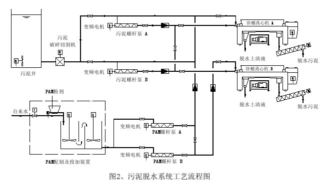 NOXON 臥螺離心脫水機(jī)的整體集成性能優(yōu)良,絮凝劑投加裝置、絮凝劑泵、污泥泵等均隨離心機(jī)配套供應(yīng),在自控系統(tǒng)的支持下,組成了一個有機(jī)整體,其工藝流程如圖 2 所示。