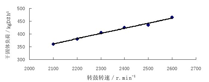 所謂干固體負(fù)荷是指每小時處理的不揮發(fā)固體重量,以 KgDS(干污泥)/h 表示。調(diào)整離心機(jī)的干固體負(fù)荷,對污泥脫水效果有很大影響,當(dāng)進(jìn)泥流量(即“水力負(fù)荷”)達(dá)到一定程度,所帶入的懸浮物含量超過了離心機(jī)所能承受的最大干固體負(fù)荷時,會造成泥餅含水率增加,上清液帶泥增多,此時應(yīng)該減少進(jìn)泥流量,使離心機(jī)脫出的上清液清澈在實際運(yùn)行中,必須通過調(diào)整水力負(fù)荷,來保證進(jìn)入離心機(jī)干固體負(fù)荷不超過離心機(jī)的最大承受能力,否則,多余的干固體將從上清液中排出,上清液的懸浮物會急劇增多,但脫水泥餅的產(chǎn)量并沒有增加。該廠使用的離心機(jī),當(dāng)轉(zhuǎn)鼓轉(zhuǎn)速為 2300rpm、進(jìn)泥濃度為 35 g/L 時,離心機(jī)運(yùn)行的干固體負(fù)荷可達(dá) 405kg/h。當(dāng)離心機(jī)磚鼓轉(zhuǎn)速增加時,干固體負(fù)荷也會相應(yīng)增加,圖 3 是最大干固體負(fù)荷隨離心機(jī)轉(zhuǎn)鼓轉(zhuǎn)速變化的曲線。