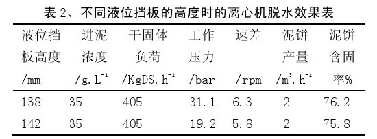 (6) 通過改變液位擋板的位置來調(diào)整離心機(jī)的液環(huán)層厚度,對離心機(jī)污泥脫水效果的影響非常大,必須通過反復(fù)的試驗,將液環(huán)層厚度設(shè)定在合適的水平,則可以保證污泥的含水率會降低,并且有較高的污泥產(chǎn)量;
