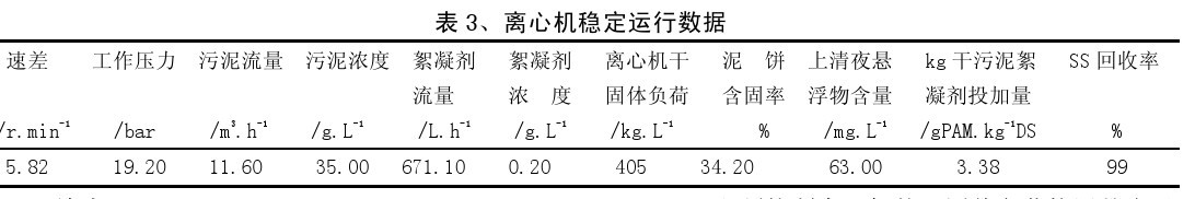 具體操作時,初始階段,按每公斤干污泥投加 6克 PAM 的投藥量,在保持絮凝劑投加量固定不變的前提下,通過調(diào)整污泥螺桿泵的轉(zhuǎn)速,按最大流量進(jìn)泥,從低到高逐漸提高速差,直至上清也完全清澈,如果速差已經(jīng)提高到 7 r/min 以上,上清液的懸浮物含量仍然較多,說明進(jìn)泥量已超過離心機(jī)的最大干固體負(fù)荷,此時按 100%、90%、80%、70%、60%、50%、40%的梯度逐漸降低進(jìn)泥流量,直到出現(xiàn)良好的上清夜;經(jīng)過上述調(diào)整,待離心機(jī)運(yùn)行穩(wěn)定后,逐漸降低絮凝劑的投加量,直至在最少的 PAM 的投藥量情況下,都能獲得良好的泥餅含固率和上清液含固率為止。離心機(jī)穩(wěn)定運(yùn)行時的數(shù)據(jù)見表 3。