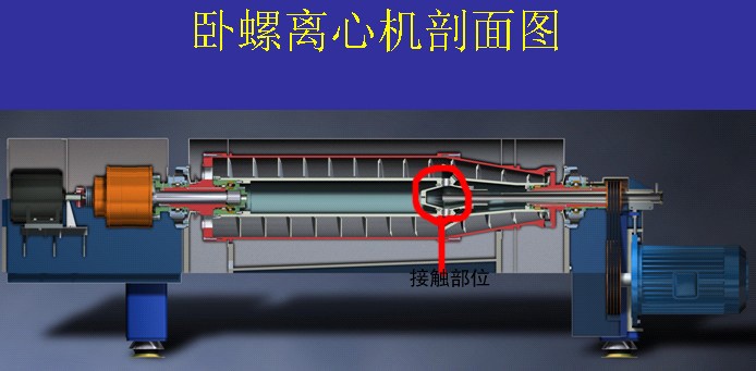 綜述:以上第4點是解決離心機運行時的靜態(tài)耐磨措施,由于泥漿等硬質廢水剛進離心機有一定的沖擊磨損及動態(tài)磨損,從離心機剖面圖上可以看到,廢水是經進料管直接通到離心機紅圈部位(如圖1),此部位我們設計了凹槽結構,就是為了減少泥漿對初接面的沖擊力,經此回流的低速廢水就可以安全處理了。在初接面的區(qū)域設計實心(如圖2),即便有沖擊磨損,實心區(qū)的材質也足夠5年以上的磨損,離心機也得到最大限度的保護。