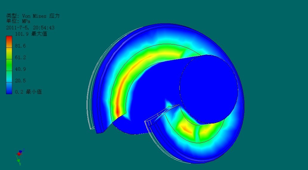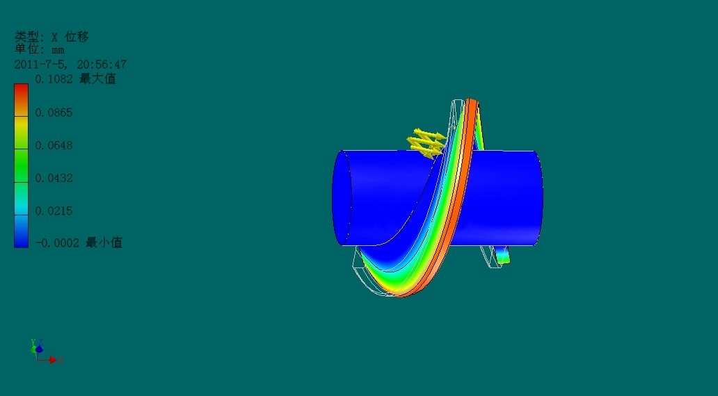 下面我們通過對(duì)螺旋葉片施加一定的載荷,來反映在工作狀態(tài)下螺旋葉片最大應(yīng)力和變形發(fā)生的位置。下面我們從ANSYS有限元分析的結(jié)論圖中選定:Von Mises 應(yīng)力(Von Mises 應(yīng)力是基于剪切應(yīng)變能的一種等效應(yīng)力,其含義是單元體形狀比能達(dá)到一定的程度)和X方向上的位移這兩幅分析圖,既可以清楚反映葉片的根部應(yīng)力值最大的問題,同時(shí)從位移圖中可以看出葉片外端部所受的位移變化之最大。