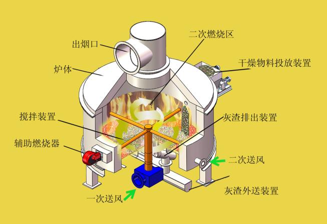 2.儲(chǔ)存?zhèn)}里的污泥通過輸送機(jī)均勻定量的將污泥送入立式清潔焚燒爐進(jìn)行焚燒處理,焚燒后形成的炭化物在燃燒過程中逐漸向立式清潔焚燒爐中心移動(dòng),徹底完成焚燒的灰渣經(jīng)由多孔管吹出的空氣得到冷卻,最終從處于中心部位的灰渣排出口排出;