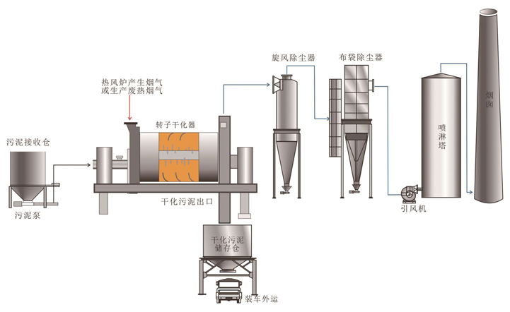 2.脫水污泥被輸送至轉(zhuǎn)子干化器,通過直接與熱煙氣接觸,在干化器內(nèi)實現(xiàn)加熱和干化;經(jīng)干化后的物料進(jìn)入干化污泥儲存?zhèn)}后外運再利用;